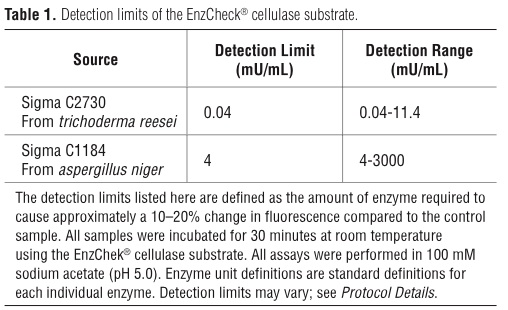 Detection limits may vary with instrumentation and enzyme source. Enzyme activity may vary depending on incubation buf- fers and temperature, as well as the storage conditions and number of freeze-thaw cycles to which the enzyme preparation has been subjected. Different dilution schemes of the same enzyme source may also cause variation in activity. Cellulase complexes may contain multiple classes of enzymes. For these reasons, we recom- mend preparing new standard curves on the same day samples are run, preferably on the same microplate. Use an appropriate enzyme standard of known specific activity that closely matches the cellulase activity being determined.