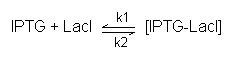 - LacI and IPTG undergo a secondary set of reactions when IPTG is added in. We assume that 1 molecule of IPTG binds to 1 molecule of LacI, creating an intermediate reaction complex: