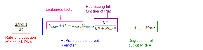 At steady state: [math]\displaystyle{ Mout=\frac{k_{mout}}{d_{mout}}[k_{leak}+(1-k_{leak})\frac {K^n}{K^n+P_{lacI}^n }] }[/math] where kleak is the lac promoter leakiness factor, K is the switching threshold of PlacI} concentration needed to repress, n is the hill exponent kmout is the transcription rate of Mout and dmout is the degradation rate.