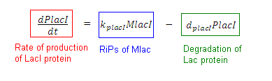 At steady state [math]\displaystyle{ P_{lacI}= \frac{k_{mlac} k_{plac}}{d_{mlac} d_{plac}} }[/math] , where khttp://openwetware.org/skins/common/images/button_bold.pngplac is the translation rate of lacI protein and dplacI is the degradation rate of PlacI.