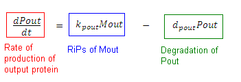 Equations 3 and 4 describe the transcription and translation of the protein of interest Pout.