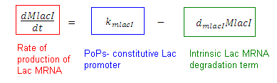 kmlacI is the transcription rate of MlacI (a measure of promoter strength) and dmlacI is the degradation rate.
