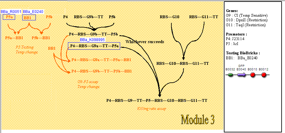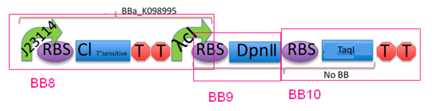 | (13) | P4 + (RBS - cI - TT) + P5 + (RBS - DpnII) + (RBS - TaqI - TT) | 4 | SLIC | (P4 - RBS - cI - TT - P5 - RBS - DpnII - RBS - TaqI - TT) | This will only be constructed with one P5 (using testing previously to determine which one) |