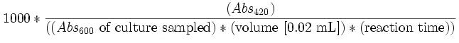 Miller (1973) noted that 1 mg of beta-gal was equivalent to 300 OOO units of activity Mass of beta-gal is 116kDa. Therefore, moles of beta-gal can be correlated to Miller units of activity by the equation: Moles= (1/116)* Activity/(300 000)