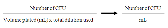 Using the colonies counted, the number of bacteria per mL of diluted sample can be determined using the equation: