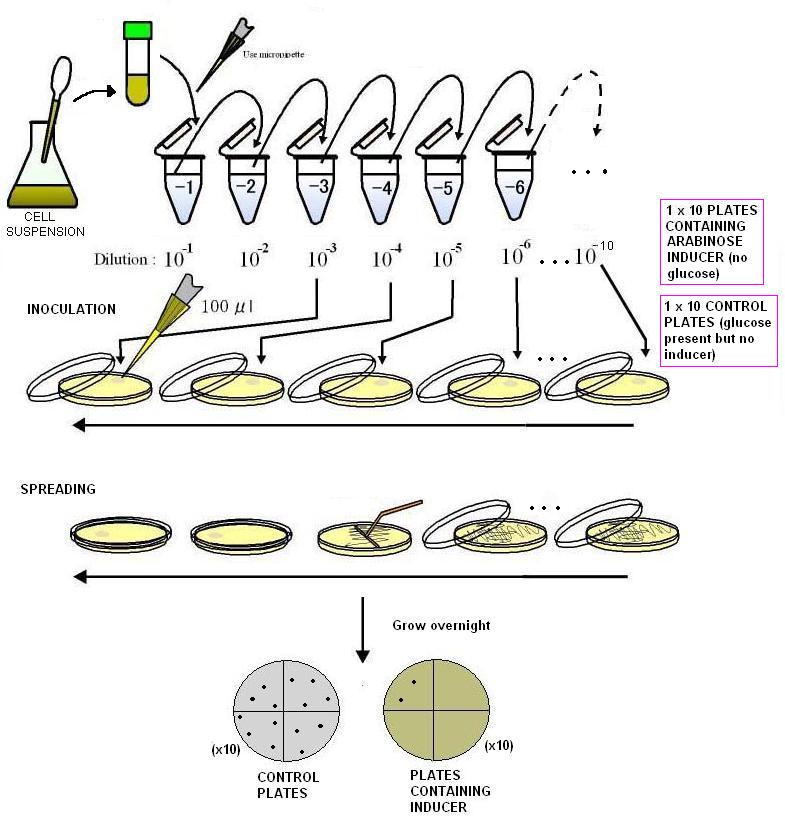 1. For each dilution, count the number of colony forming units on your plates. (For the control plates, 30 and 800 are considered statistically accurate. For plates containing the inducer it is expected that fewer or no colonies will be visable).