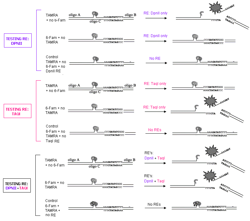 The two fluorophores, TAMRA and 6-Fam, emit at different wavelengths (see protocol) and are cut by DpnII and TaqI respectively. The following diagram shows the principle of testing each restriction enzyme in this assay individually, and then together. Controls are used throughout as shown.