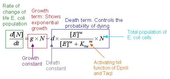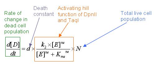 The death term comprises of the death constant, d, the activating hill function of restriction enzyme concentration, and total live cell population. An activating hill function is chosen based on the fact that an increase in restriction enzyme concentration will increase the probability of cell killing.