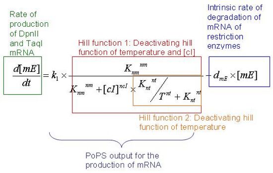 The first term is the PoPS output. It is the combination of a repressing hill function of the concentration of functional cI protein, and deactivating hill function of temperature.