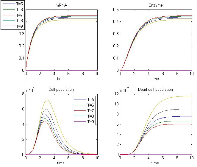 - If the temperature is above threshold, the population growth of live cells is constrained by the concentration of restriction enzyme.
