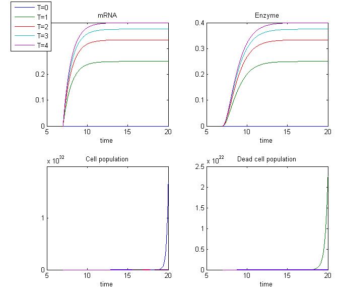- When restriction enzyme concentrations are subthreshold, the death term is close to 0, so the population grows exponentially (as we see for T=1-4 in simulations)