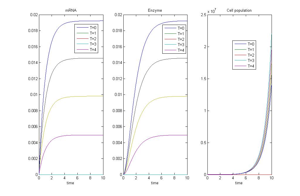 figure(3);subplot(1,3,1);plot(T,A13); TITLE('mRNA');xlabel('time');legend('T=0','T=1','T=2','T=3','T=4');