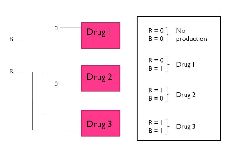 4 possible light input combinations (use red and blue light receptors from the biobricks registry):