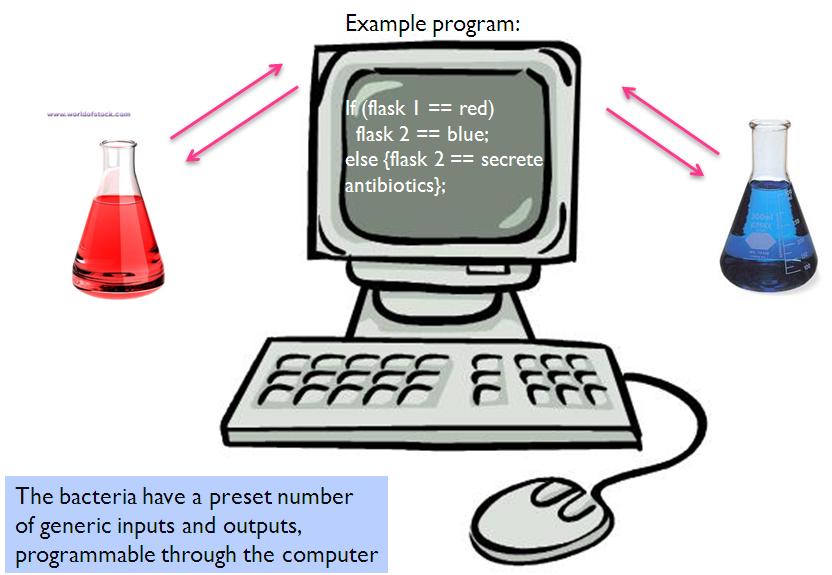 This is an example of a 1-many function in maths. Here, we have one computer interfacing with two (or more) cell cultures. The sample program shows that when the cells in flask 1 glows red under a stimulus, the computer causes say, chemical X to be secreted into flask 2 and the cells in flask 2 will turn blue. If however, the stimulus causes cells in flask 1 to turn green, cells in flask 2 will be made to produce antibiotics. Of course, the cells in both flasks are genetically engineered to respond to certain inputs and output different colours accordingly.