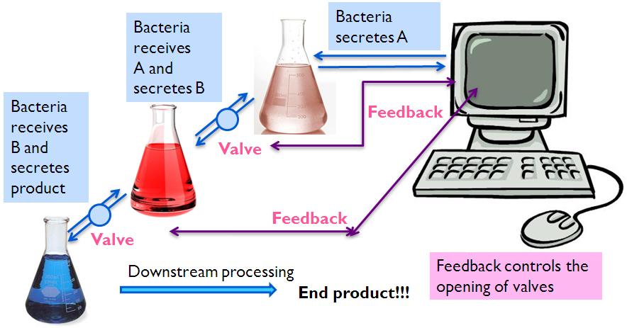 This shows a production line application of the BIB system. The computer is programmed to cause the first cell culture to start secreting A. When the concentration of A has reached the threshold, the probe detects it and the computer causes a quencher to be added into the cell culture to stop the reaction. The valve is open and A is secreted into the second cell culture. The same thing happens till the final cell culture, where our product of interest is secreted. Downstream processing is performed to isolate our product.