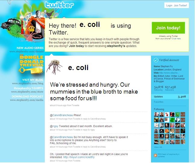 Applications for this particular last point are virtually limit-less. Ranging from Twittering bacteria (thanks Vincent) to automated email delivery when the bacteria are undergoing stress, potentially enabling the scientist to salvage weeks worth of experiments.