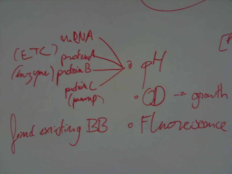 - More complicated, thus iGEMMABLE: using broths this time. Using randomly injected (via computer) inducers, the combination is determined genetically but does not result in visible change (or it does but the plate is hidden (see bullet point # 3)) ie: protein synthesis, or reporters that are analysed continuously by the computer checking against a threshold to know whether they are expressed thus working out the combination. The guesser broth, would then temporally (not in the case of custom proteins) encode/produce signals (could be colour/fluorescence, could be proteins) that are detected by the computer and analysed against. The following logic operations can either be done by computer (easy) and translated into a biological signal (but not much interest maybe) or the logics performed by a -yet to be specified construct-
