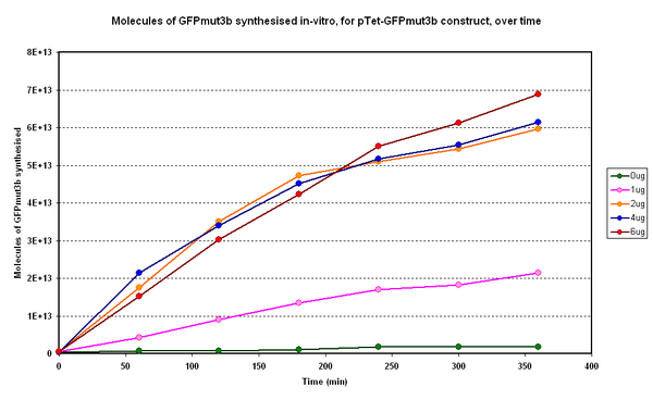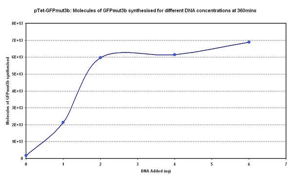 Figure 1.1 and Figure 1.2. show us that the synthesis of GFPmut3b increases with DNA added. Though the molecules of GFPmut3b synthesised increases with increasing DNA concentration, even after a concentration of 4µg. This is not what was expected because of the nature of the cell free chassis which is optimum DNA concentration = 4µg. But the increase in fluorescent moecules synthesised by increasing DNA concentration is not very big. If DNA concentration is increased from 2µg to 6µg (a percentage increase of 200%), it reuslts in only about 15% increase (at 360min) in GFPmut3b molecules synthesised. Thus it was decided that a DNA concentration of 2 or 4&micor;g will be used for testing pTet-GFPmut3b construct.