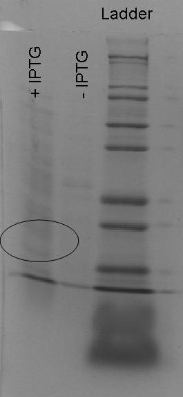 The IPTG has not induced the production of a protein which weighs 28736 kd (aiiA) this should be loacted inside the oval. We are repeating the expperiment to confirm the results. We are sequencing the part to confirm the results. The ladder is invitrogen marker 12.