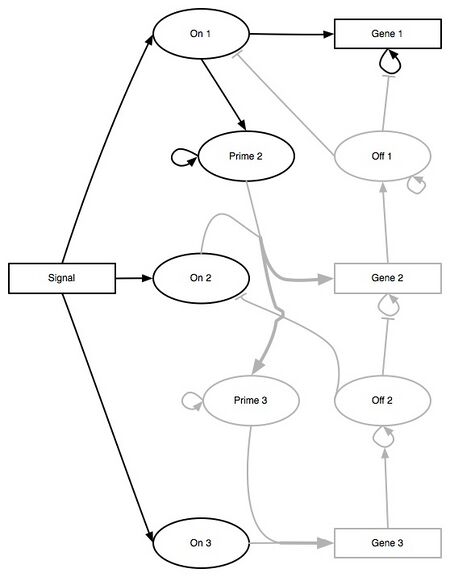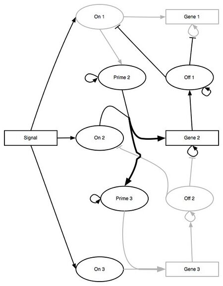 - After the signal pulse, On1, On2 and On3 degrade, leaving Prime 3 and Gene2 in the system