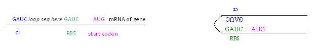 - crRNA (cis repressed RNA)--mRNA of interest containing inserted cr (cis repressive sequence). cr is just a nucleotide sequence placed on the 5’UTR (untranslated region) of the gene of interest such that it is downstream of the promoter for the gene but upstream of the RBS. Its sequence should show reverse complementarity to the RBS so that under normal circumstances, the RBS is not exposed and hence translation is repressed (since the ribosome can’t bind). In addition, the mRNA will need to contain a short nucleotide sequence between cr and RBS to actually form the loop. Below is just a crude pictorial representation of what crRNA would look like: