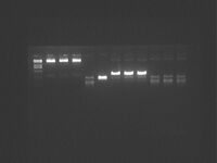 The order and the amount of the samples: marker 5μL, colony 1 digestion products, colony 2 digestion products, colony 3 digestion products, positive control, PCR products of colony 1, PCR products of colony 2, PCR products of colony 3.
