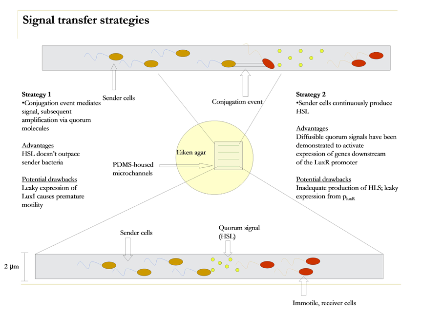 The idea for our project grew out of one for a "bacterial maze," in which bacteria would use logic to make their way through a microfabricated labrynth. This seemed slightly too difficult, so we linearized the the concept and added transfer of a signal; the idea was then dubbed a "bacterial relay race."
