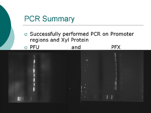 Results from over the weekend: Initial pfx pcr failed, second attempt was a success. Restrtiction, extraction, purification, ligation, and transformation was performed on the successful bands. Restriction results were verified by gel, with discernable bands. Despite this, transformations were unsuccessful.