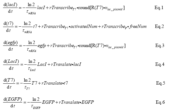 It is a little more complex to model the transcription of T7 polymerase which is regulated by a constitutive promoter, a T7 promoter and a lac operon. The transcription is considered as following conditions: The transcription ceases when LacI binding to lacO, no matter whether T7 or host polymerases are bound. Without the repression by LacI, T7 polymerase, once successfully binds to its promoter, dominates the transcription. The host polymerase functions only if neither LacI nor T7 polymerase bound. In eq. 9 and 10, number of activated DNA (i.e. DNA which form complex with T7 polymerase but not LacI) and number of free DNA (i.e. DNA which binds to neither T7 polymerase nor LacI) are calculated respectively.