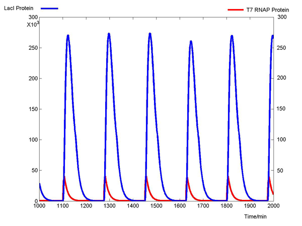 FIGURE1:T7&LacI(protein)  The protein levels of T7 RNAP(Red) and LacI(Blue) are simulated by MATLAB with parameters described above. (Note: The scale of LacI molecules is 1,000 fold of that of T7 RNAP)