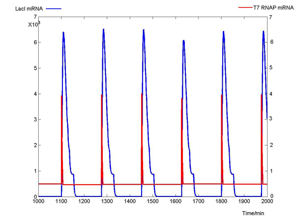 FIGURE2:T7&LacI_mRNA   The mRNA levels of T7 RNAP(Red) and LacI(Blue) are simulated by MATLAB with parameters described above. (Note: The scale of LacI molecules is 1,000 fold of that of T7 RNAP)