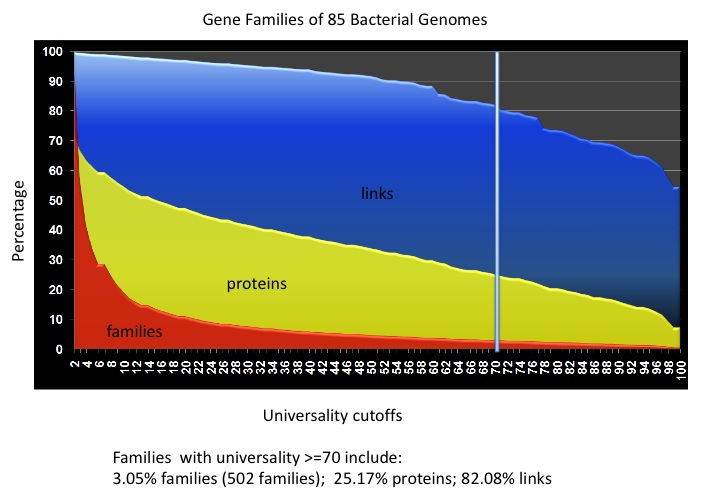 In the 502 HMM profiles, we can use the models for the 31 AMPHORA markers and the 25 new bacterial markers to identify phylogenetic marker genes from metagenomic data. We have also observed that many of the models are ready to pick up gene families with high copy number in almost all the bacterial genomes, which are one of the main hurdles to building gene families for metagenomic data. We examined the gene family building processes for the 85 bacterial representative genomes. We found that if we use the 502 HMM models to screen the whole proteome, we can cover 25% of the proteins, and - more importantly - more than 80% of the protein similarity links (See the following figure). For a metagenomic dataset, we can use the HMM models to pre-screen the protein data to build gene families, and make global gene family building feasible for the rest of the dataset.