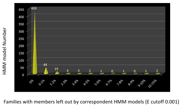 Proteins from 502 bacterial families with universality larger than 70 were retrieved. For each family, the peptides were blastp searched against each other and a similarity cutoff of 80 over 80% length span was applied to build MCL clusters. One representative from each MCL cluster was collected and served as the seed for HMM profile building. HMM profiles were built by HMMER2,and gene functions were assigned to all the profiles. The HMM models were searched against the corespondent gene families members and the genbank NRAA database to define trusted cutoffs and noise cutoffs. These HMM searches against the gene families demonstrated that the overwhelming majority of the HMM models we built represent the gene families well and can pick all the family members with the identified cutoffs. A few exceptions are illustrated in the following figure, which shows that a few proteins were included in the families but actually do not belong there and should be removed.
