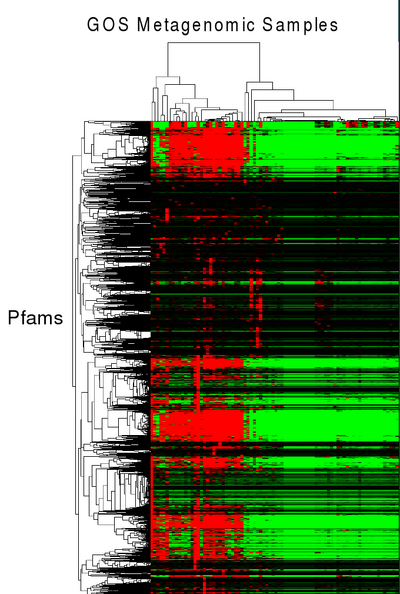 A first attempt at community profiling was done by identifying PFAMs (11,000 HMMs) in metagenomic sequences from GOS (41 million peptide sequences across 80 samples). Pfam predictions (12.5M) by HMMER 3 were grouped into their corresponding samples and enumerated. This data was then clustered using microarry clustering software, Cluster 3.0.
