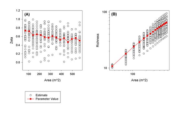 In order to extrapolate to short distances, which are generally outside of the range of the data, it is necessary to assume a functional form of the distance-decay relationship. Initially, we assumed a logistic model, which states that the logit of the Sorenson Index (a measure of similarity) decays linearly with the log of the distance. Logistic models are used widely in statistics, and we found that this model was generally a good fit to many empirical distance-decay relationships. However, within the last few months we have found that this model can lead to biased richness estimates when it is necessary to extrapolate substantially beyond the range of the observations, as is the case with metagenomic data. Moreover, it is unclear why this model is appropriate for distance-decay relationships: to our knowledge, there is no a priori reason to expect that the distance-decay relationship should be logistic.