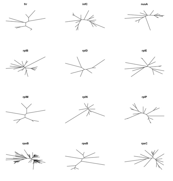 We’ve identified 66 gene families that spread across at lease 90% of the 85 bacterial genomes with even distributions. As gene marker candidates, we’ve identified 27 families that are single copied in all the organisms. 25 families have multiple copies of genes because of recent gene duplications, which were suggested by phylogenetic trees. 27 of the 52 families were already included in AMPHORA as phylogenetic markers. Maximum likelihod trees were built for the non-redundant sequences of the 52 gene families, as well as for the small subunit rRNAs and the concatenated alignments of 31 AMPHORA protein markers. Topological distances between the individual gene trees and the concatenated genome tree were calculated by the TOPD/FMTS package. Both NODAL and SPLIT distance results suggested that the 25 new phylogenetic maker candidates are as good as the 27 AMPHORA makers if we only take the similarity of gene trees and the genome tree into account. More detailed comparison is underway to estimate how the new markers perform for different taxonomic groups at different taxonomic levels.