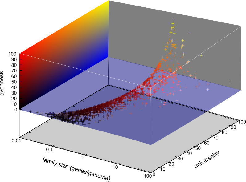 A protocol has been developed to classify gene families automatically. The protocol is base upon Blastall and the Markov clustering algorithm so the protocol are automated, robust. We use an e value cutoff of 1e-10 in our test run. For the 313139 genes from the 100 selected genomes, we identify 23336 gene families that include a total of 239453 genes. In order for automatically select gene families for potential markers, we've developed a program that not only evaluates the universality of the gene families, but also estimates the evenness of the distributions of the genes across a selected group of genomes (See the figure below).