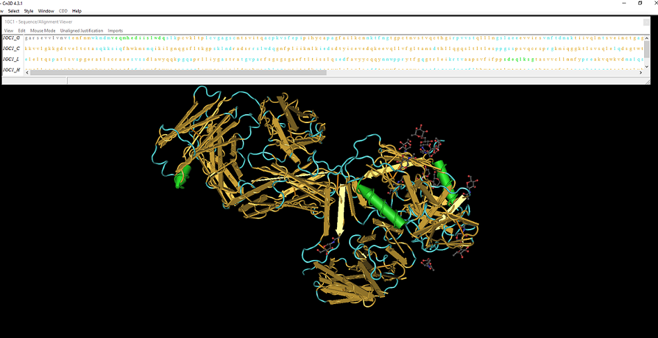 - To highlight the secondary structures for the complex given in the Kwong study, click the style tab, then coloring shortcuts, then select secondary structure. Highlighted in the picture below are the secondary structures for the 3D structure from Kwong et al. (1998). In yellow are the beta sheets, while in green are alpha helices within the complex. The predictions made by the PredictProtein server seem to match with those made by the Cn3D software for the gp120 molecule.