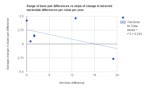 After analyzing the data of all 6 subjects using correlation analysis and minimum/ maximum distances between sequences, we did not find any data to support our initial hypothesis. This suggests that, at least using the data from the Markham et al. paper, initial differences between baseline nucleotide sequences are not enough to explain the final values for the slopes of change in intravisit nucleotide differences per clone per year. This lack of correlation is also seen when comparing initial clone number and range in nucleotide differences compared to final slope. Later studies suggest that the results may be explained by a lack of information on the subjects, such as outside factors that could have contributed to the differences in immune response and the subsequent change in diversity seen across HIV strains.