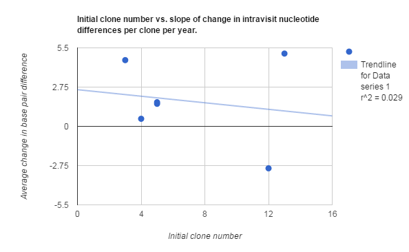 - Initial clone number vs slope of change in intravisit nucleotide differences per clone per year