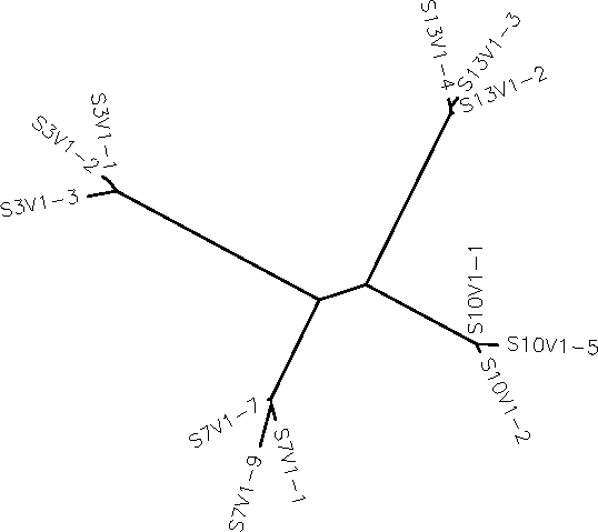 The clones from each subject do cluster together Subjects 10 and 13’s clones are the most clustered together. Such clustering perhaps is indicative of a close evolutionary relationship among clones. All of the clones of each subject appear to share a common ancestry, but the branching out of each could mean that the viruses are diversifying. None of the subjects cluster together, they are about equally apart. I take this to mean that each subjects virus is about equally different from the other.