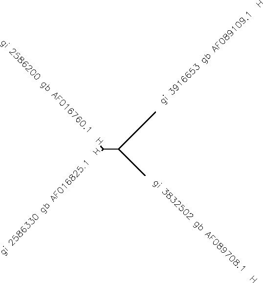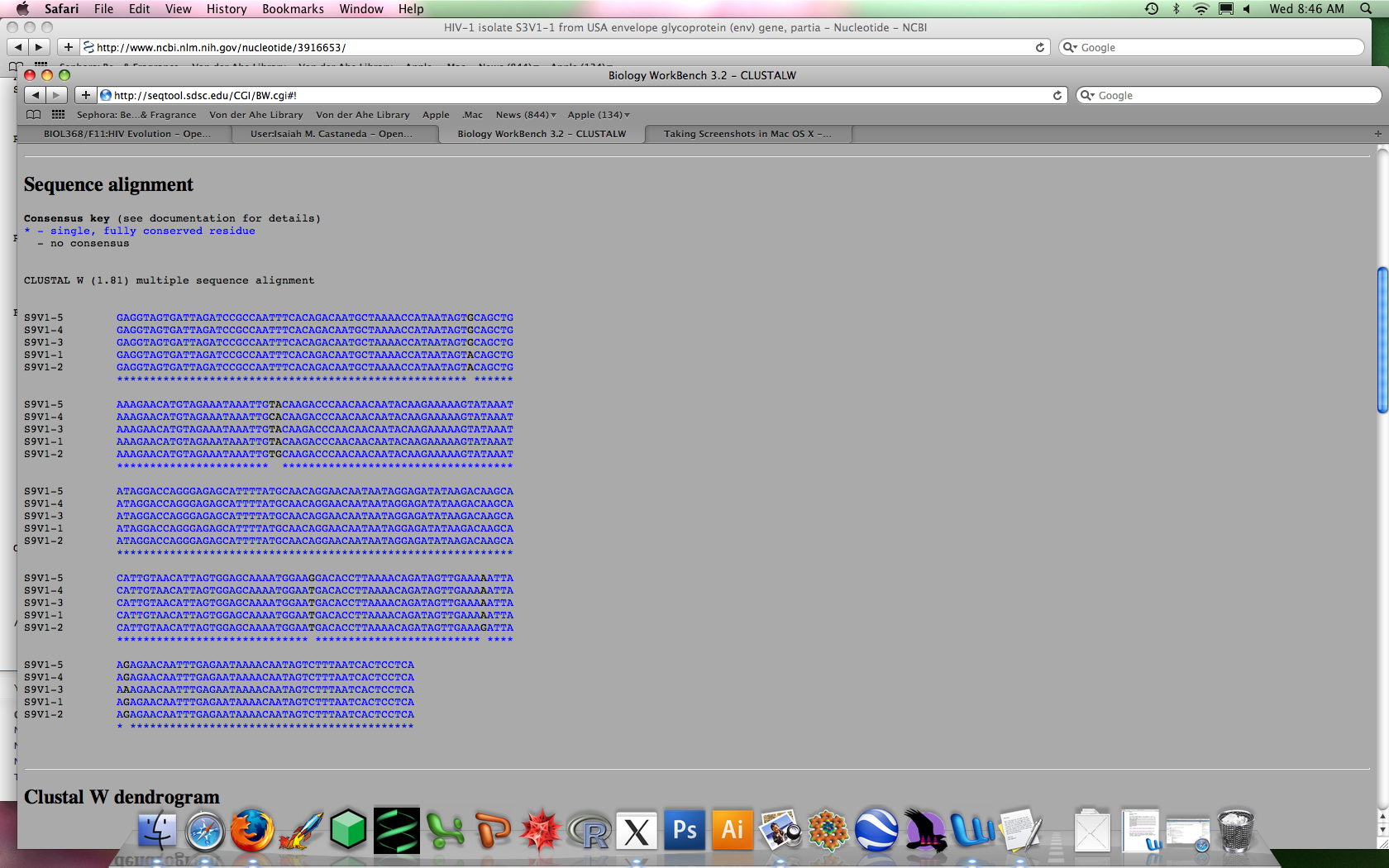 Part 3: Intro to the Biology Workbench I opened up the appropriate website to be confronted with the challenge of setting up an account. I performed this swiftly and quickly and then carried on. Worried that I might incorrectly save the 4 sequences I chose earlier, I copied and pasted the label into the label section and the sequence into its appropriate box for each sequence. I made sure that the program recognized that the FASTA template was being used as well. After running the multiple sequence alignment, I attained the following unrooted tree diagram.