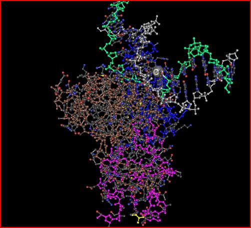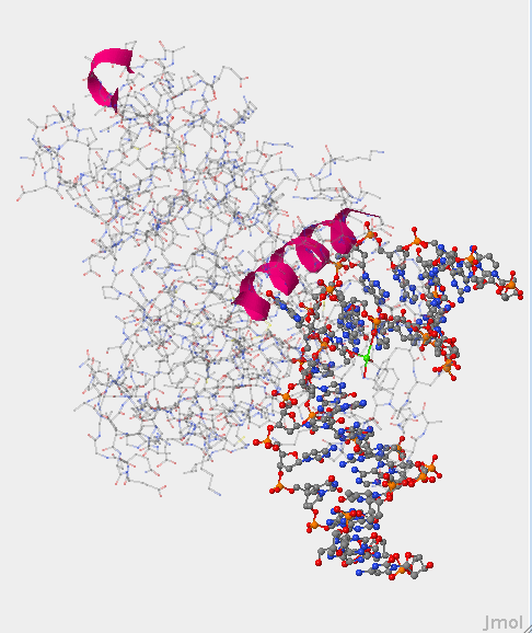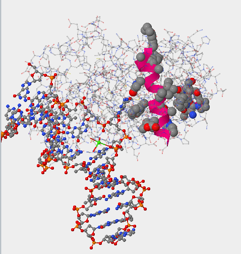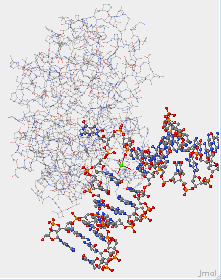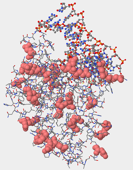 - The DNA is located at the top of this picture and the protein in located below it.  The protein atoms are enlarged.