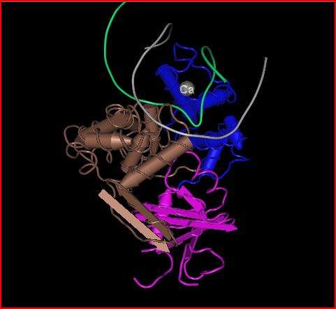 - By using the coloring domain shortcut, I can see 3 distinct domains in the protein, colored blue, brown, and purple in the image below.