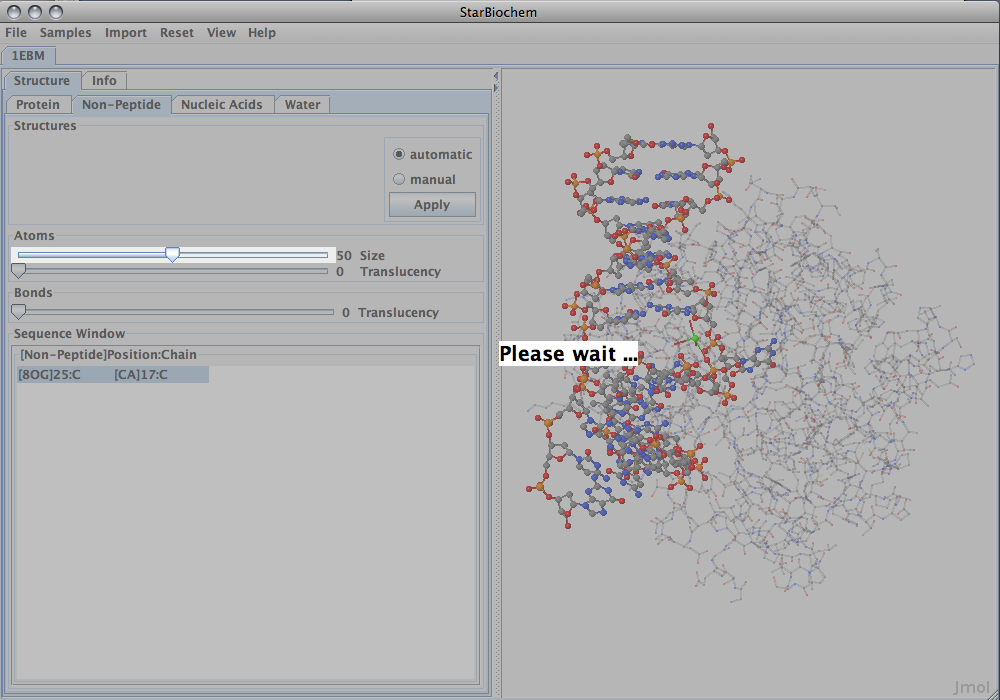 - (c)  Increasing atom size in the non-peptide tab freezes the program as well. After finding the Guanine, I note that it is out of the helix, facing toward the protein. Perhaps the hOGG1 protein beaks the bond between a base pair to check a specific base.