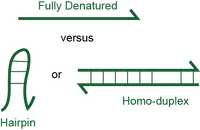 Now, the duplex in the illustration looks like normal DNA duplex as we've discussed before. However, in this case, the oligo is annealing to another of its own kind rather than to some template molecule. For both hairpins and duplexes, these are undesirable states for most molecular biology operations because they compete with the template for binding. So, you want the 'self Tm' (which basically is the Tm for whatever is the most stable self-secondary structure) to be low, meaning 'not a particularly stable state'. In practice, other design heuristics we use such as balancing GC content, avoiding homopolymeric runs, and so forth have the desirable side-effect of eliminating this type of secondary structure (often, but not always). So, personally, I very rarely check the self-Tm of oligos, and I do not recommend you worry about it unless you cannot make a 'normal' oligo for the task at hand. Under those circumstances, try your best to keep it below 40°C. It is definitely not the case that higher self-Tm values will cause PCR to fail--I've done PCRs successfully with 80°C self-Tm. However, really bad self-Tm is definitely something that can cause a PCR to fail. So, if you have a really long oligo or an oligo with a weird sequence, you might check this.