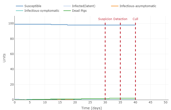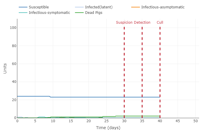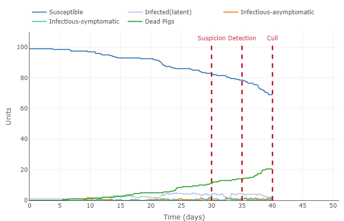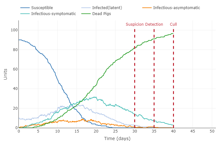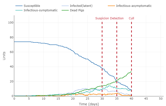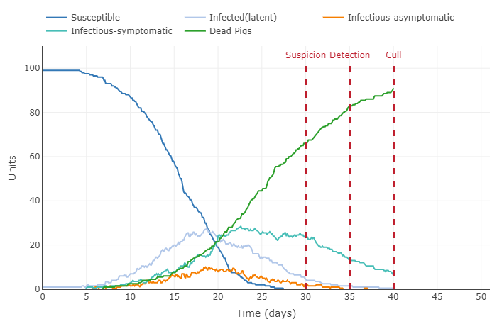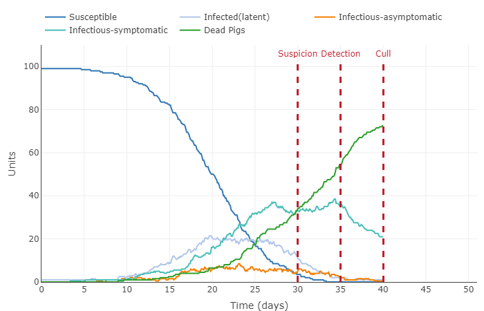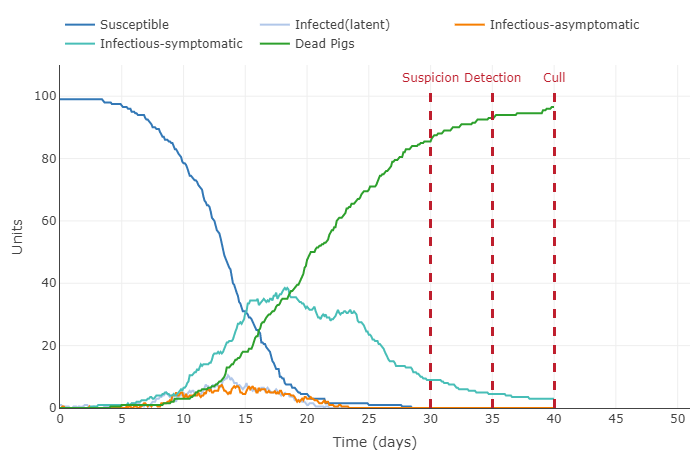 - This graph shows the pig population getting infected fairly quickly. 100 percent of pigs were infected around the 37th day, this the majority of those pigs dying before the culling on day 40. All the latent, asymptomatic, and symptomatic infections percentages were below 20 percent of the total population.