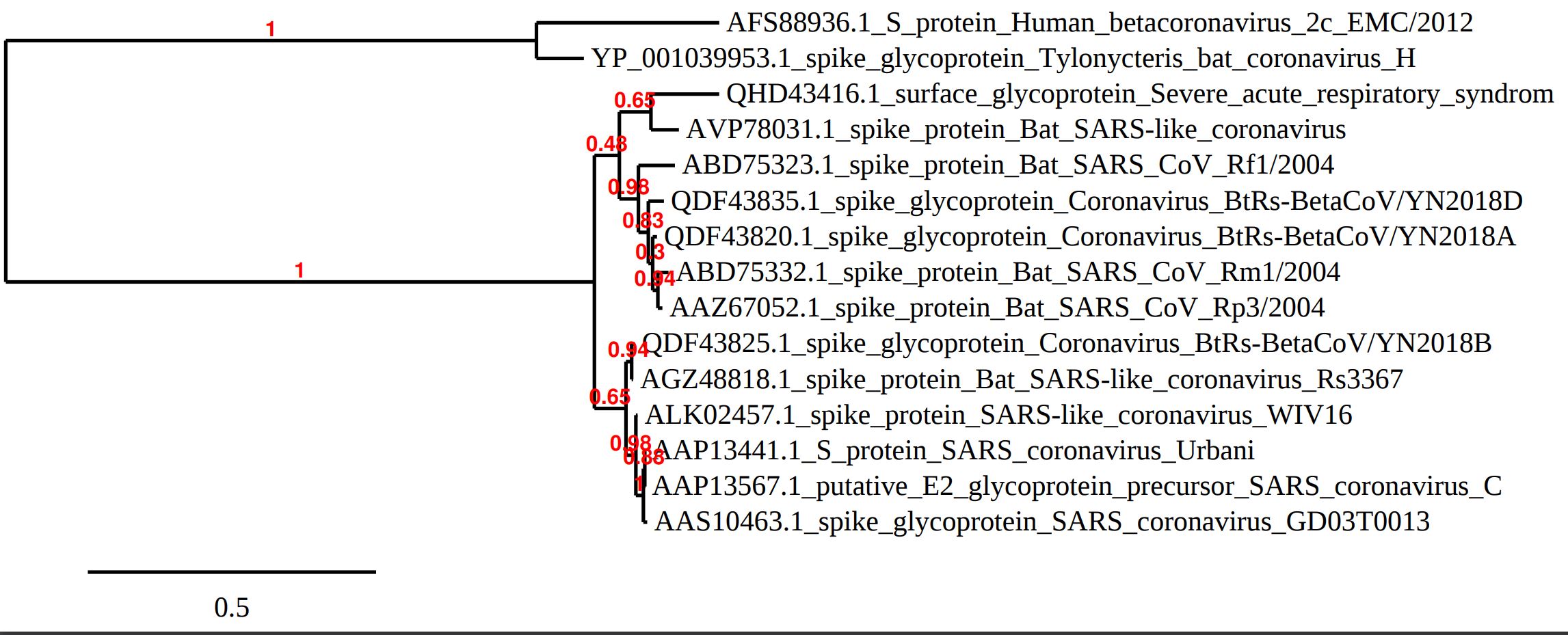 - While we could create a phlylogenetic tree with the entire genome sequence of the viruses, in this analysis we are mainly interested in the spike protein.  Links have been provided to the individual spike protein sequences corresponding to each of the viral genome records listed in the Data & Tools section.  We are going to "crowdsource" gathering the sequence data from 12 other viral strains that are listed in Figure 2 of Wan et al. (2002).