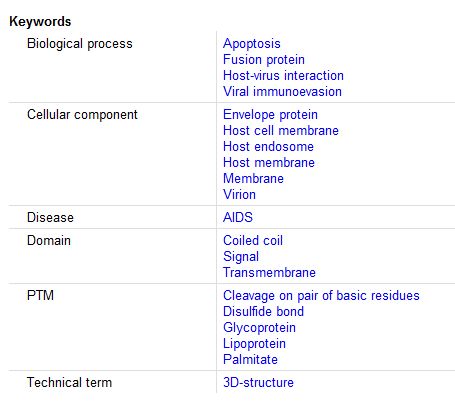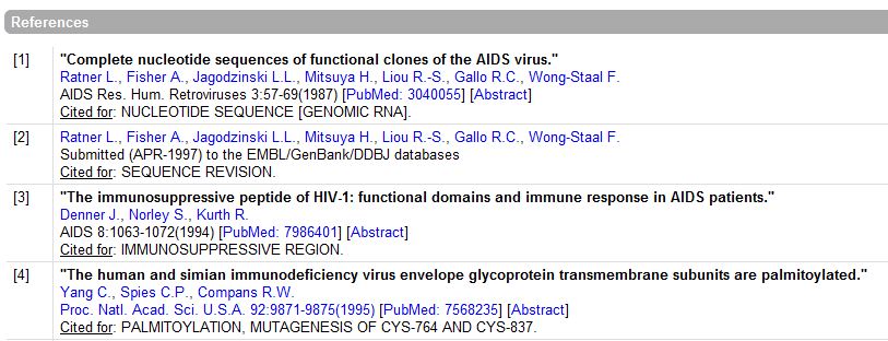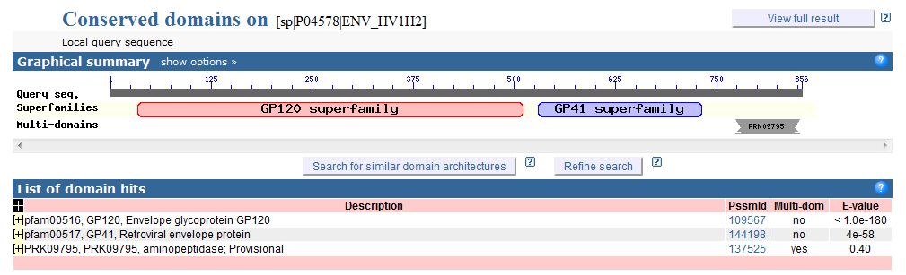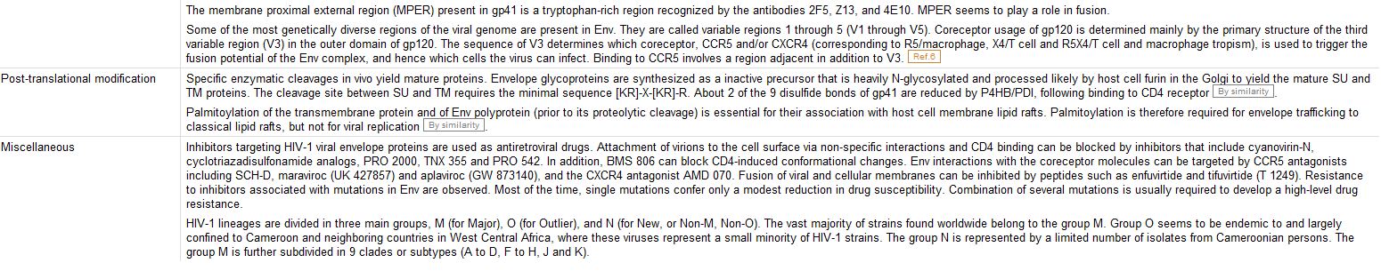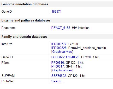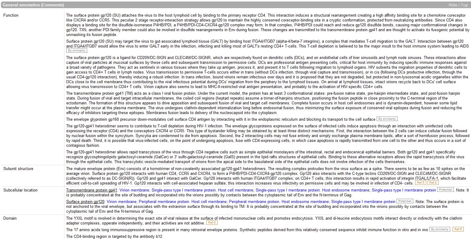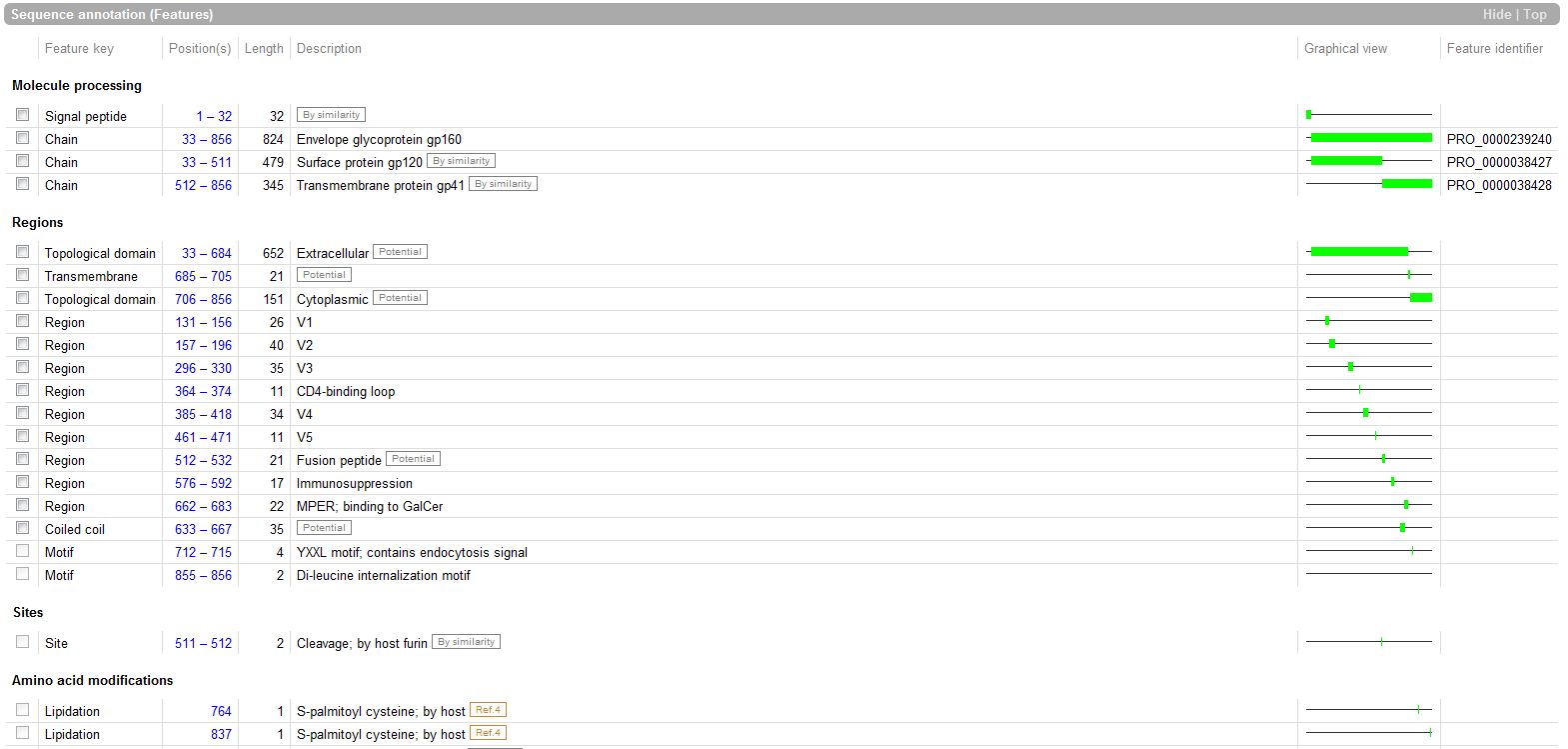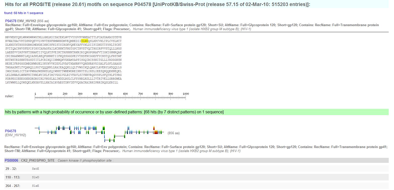 - We typed in “HIV gp120 envelope protein”, eliminating TrEMBL unsupervised computer translations, and obtained four pages of results. We selected P04578, ENV_HV1H2, Human immunodeficiency virus type 1 (isolate HXB2 group M subtype B) (HIV-1), to view amino acid sequence using FASTA formatting.