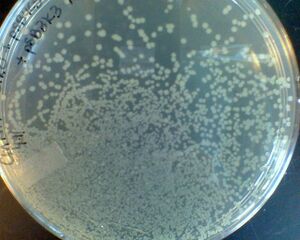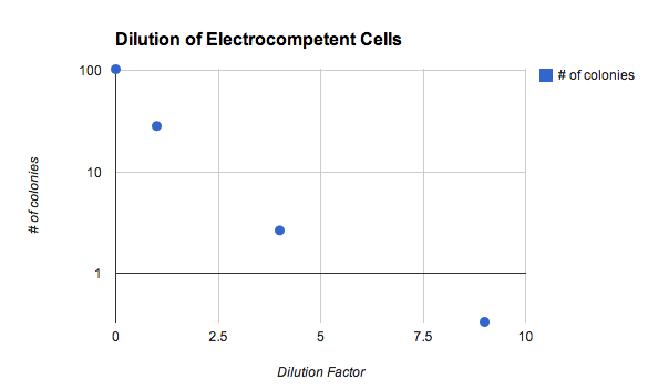 - In the experiment described just above, I calculated that for 0.1 ng of plasmid, the maximum efficiency was 5*10-6, defined as the fraction of plasmids that led to colonies (not CFU/ug DNA). I haven't looked up literature values to see how this compares to published statistics. This statistic makes Gibson cloning seem even more amazing. Even if you get only a few colonies, there were likely many orders of magnitudes more viable plasmids in the transformation product than that!